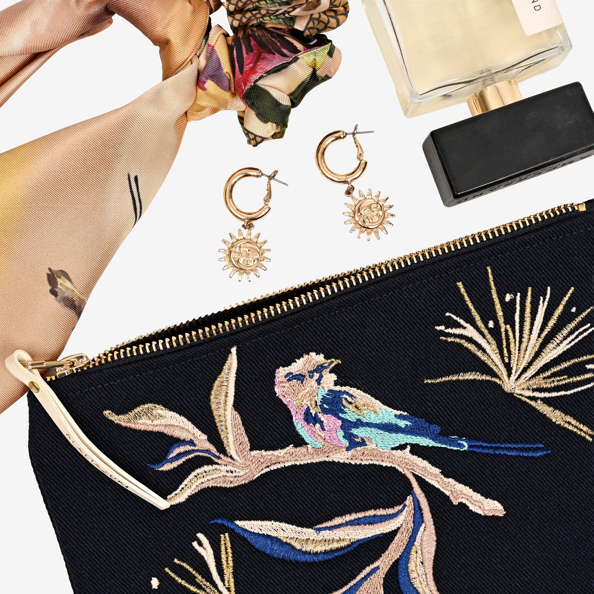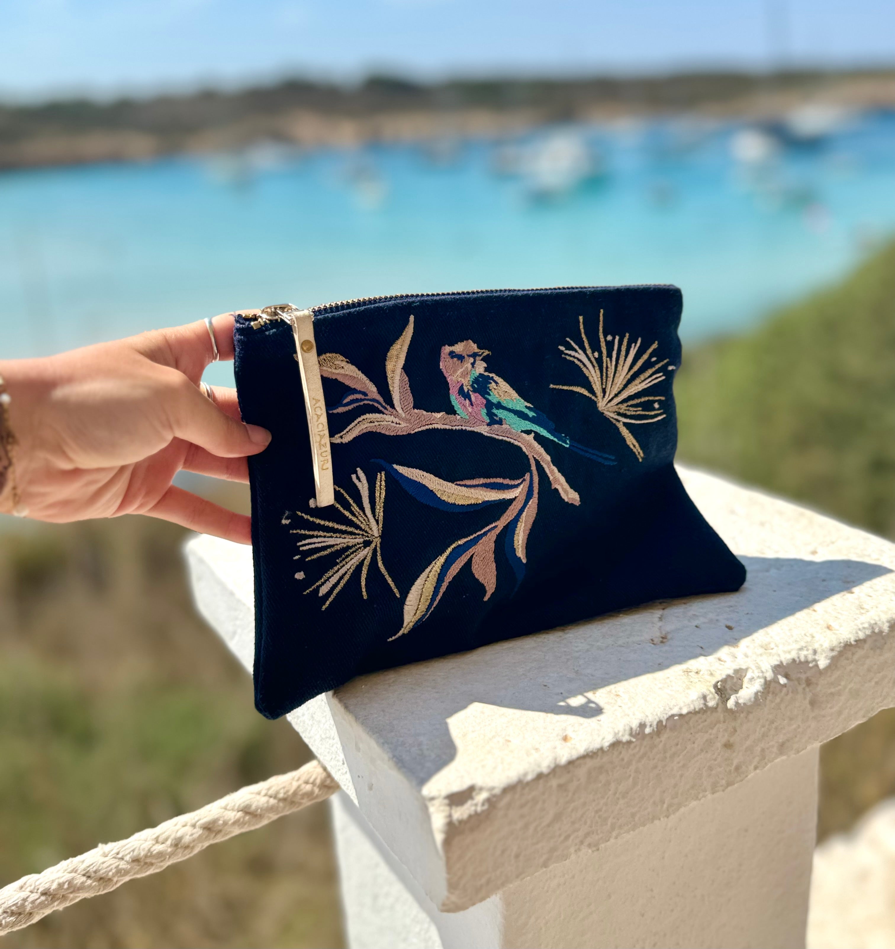 Inspired by Africa’s enchanting lilac-breasted roller, the Lilac Embroidered Bag celebrates vibrant colour and artistry. Hand-illustrated and intricately embroidered onto deep navy cotton canvas, this bag features Acacia's favourite bird from her childhood growing up in Zambia. A versatile pouch that combines storytelling with timeless functionality.