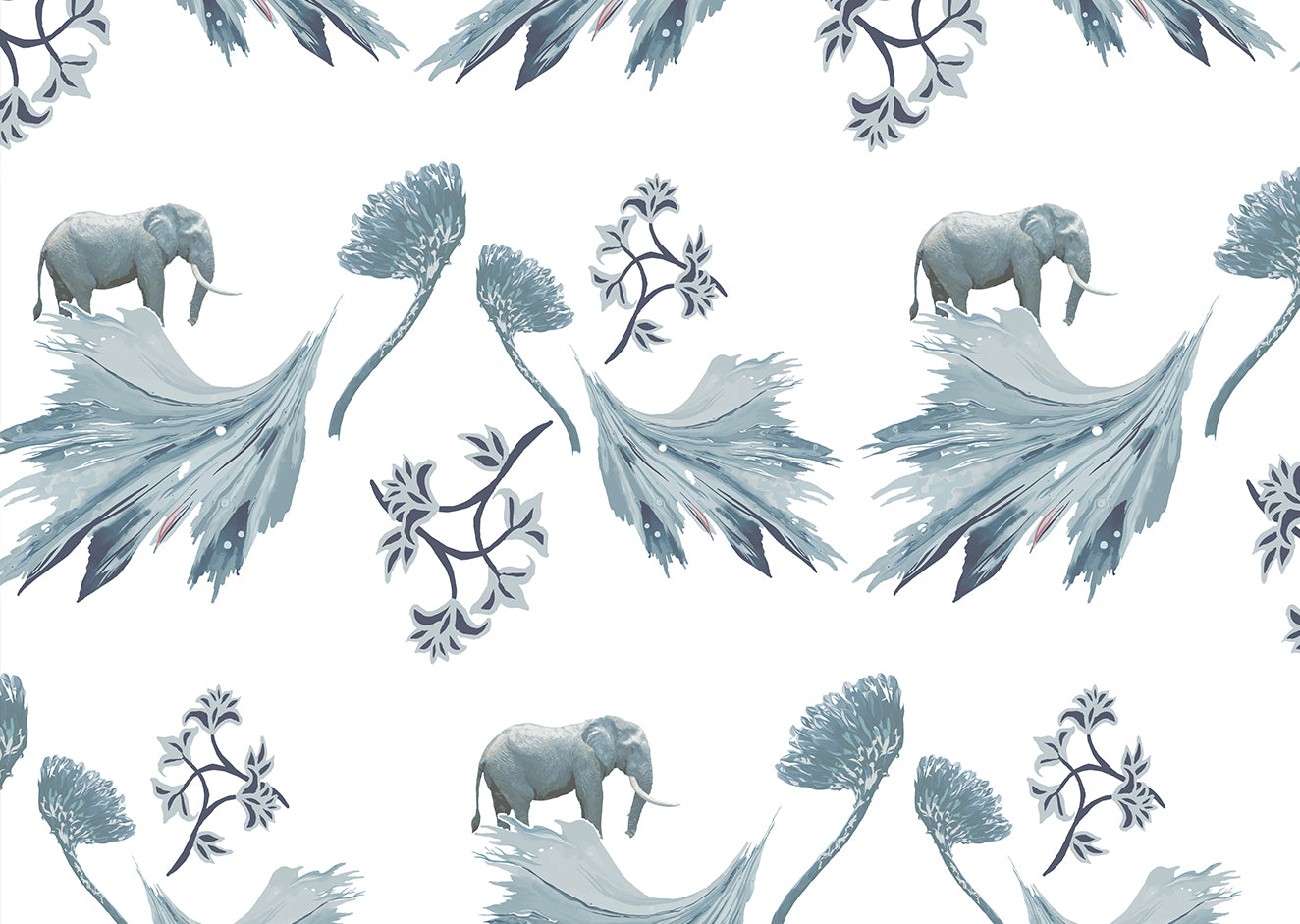 A dreamlike safari scene, where majestic elephants meet flowing botanical brushstrokes and blooming African peace lilies. Inspired by misty mornings and airy florals.