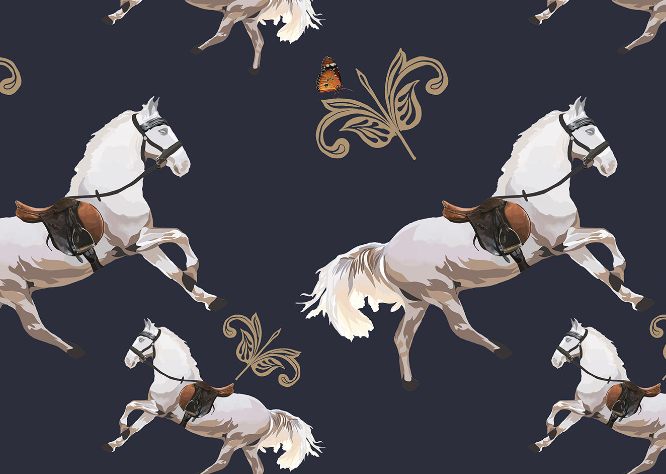 Inspired by the timeless elegance of the stables and the spirit of countryside escapes. This design paints sweeping grey horses in motion, accented with rich saddlery details. Set against a deep navy backdrop with delicate monarch butterflies, this print celebrates both tradition and freedom, bringing a touch of refined countryside luxury into your everyday wardrobe.