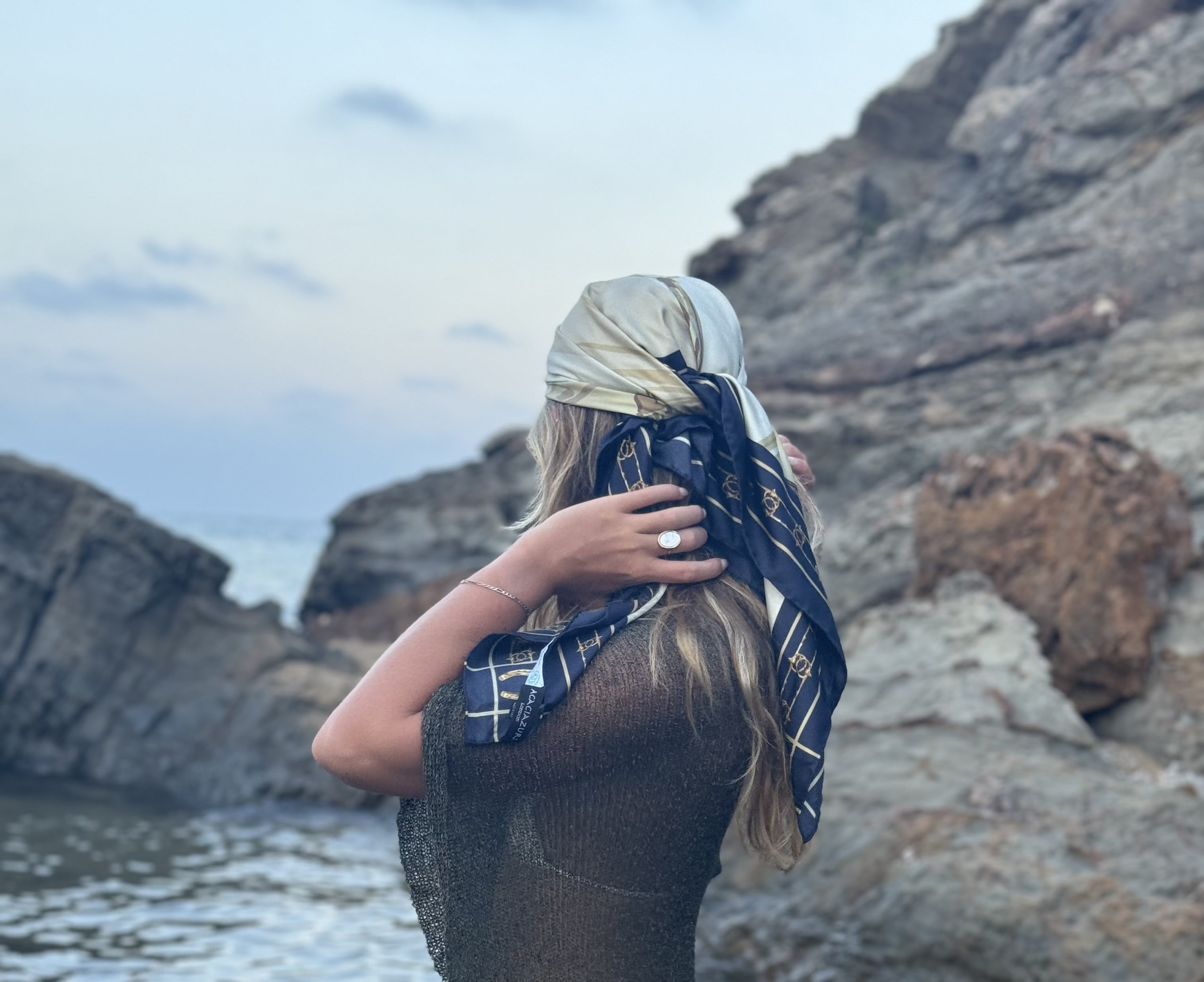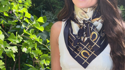 Adorned with boldly oversized horse shoes combined with elements of decorative horse tack, this scarf achieves both simplicity and elegance. The rich navy and golden hues make it an easy and luxurious addition to any outfit.