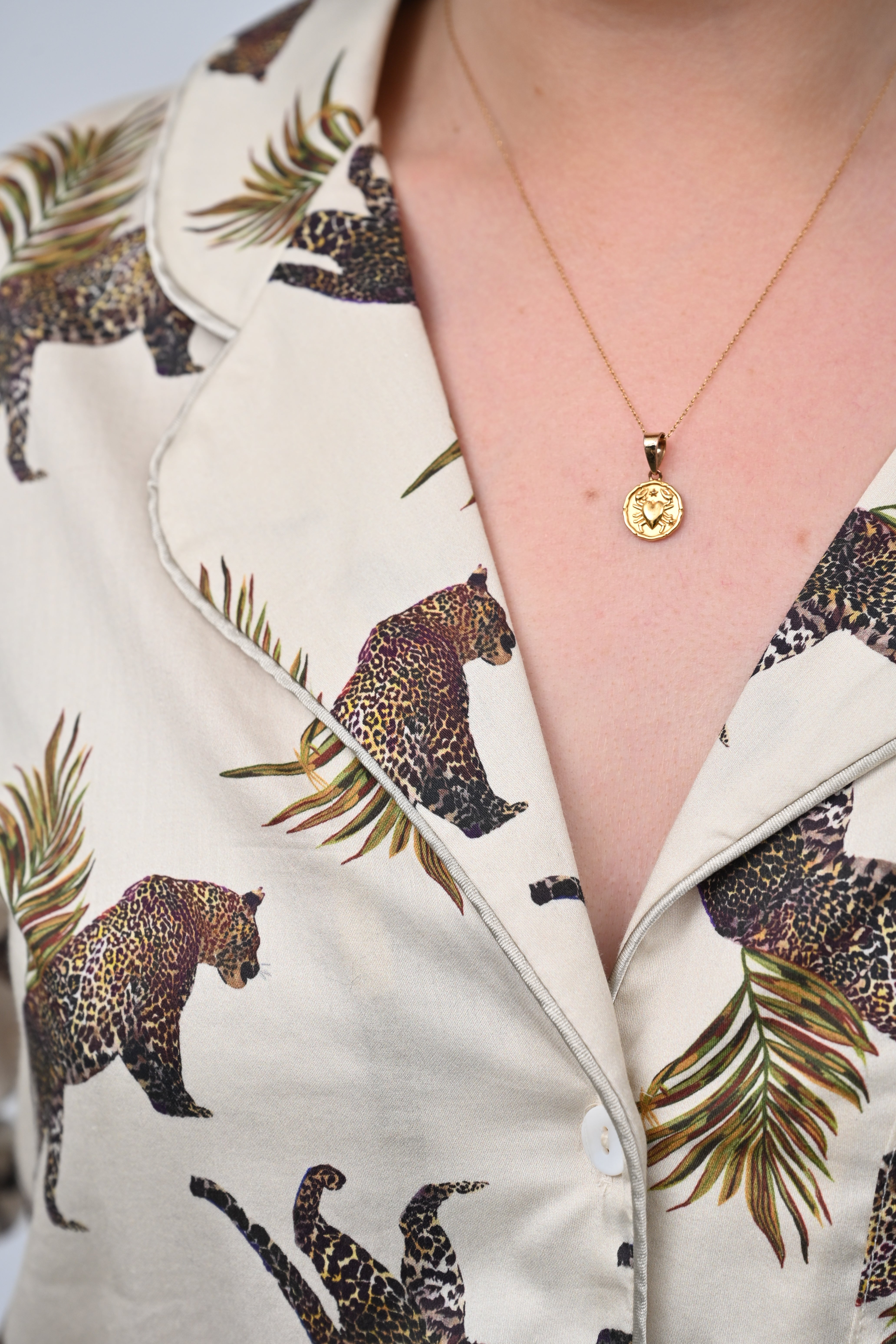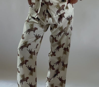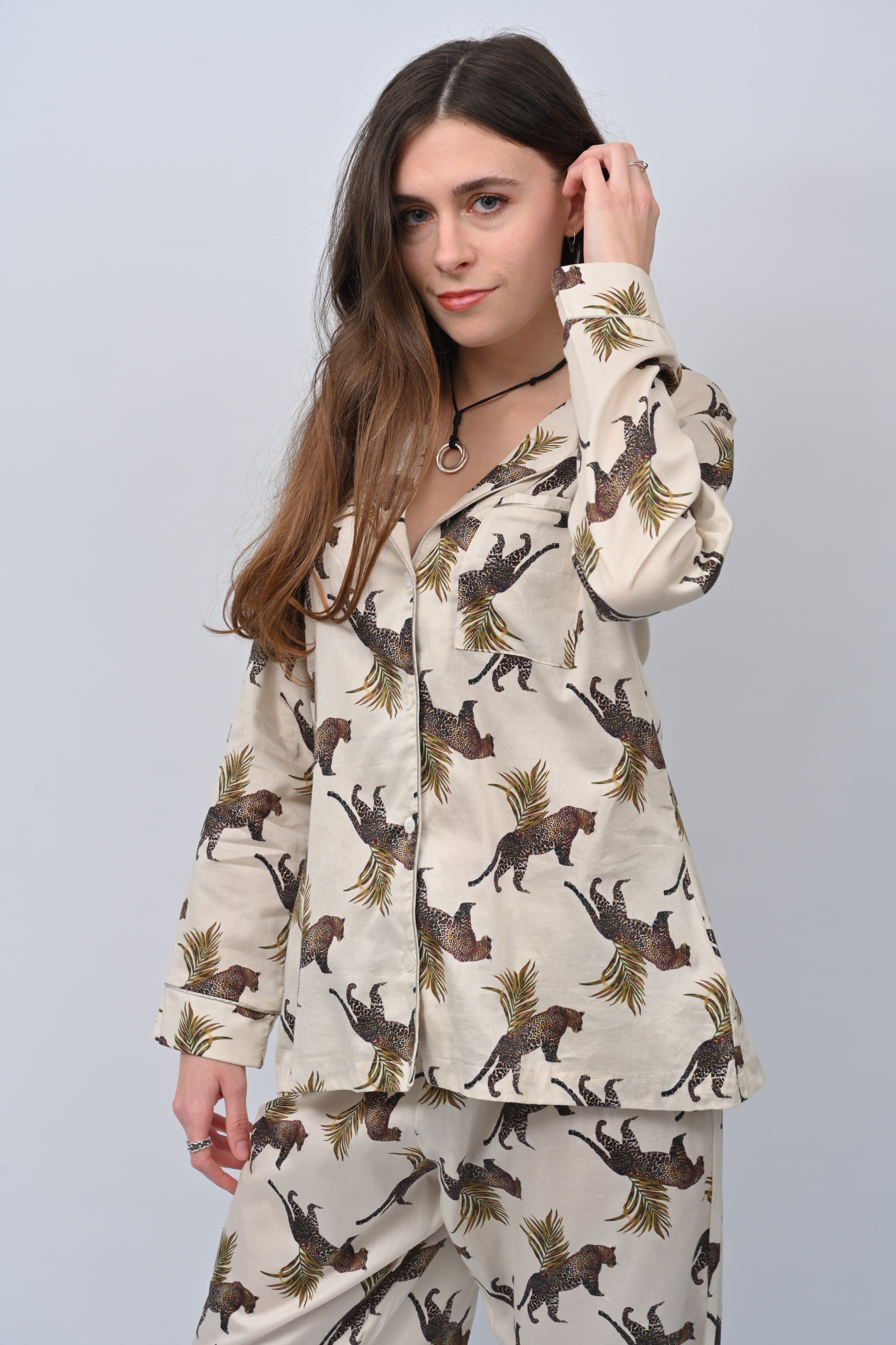 Hand-illustrated leopards prowl across a backdrop of soft cream, framed by sweeping tropical palms. This print celebrates the untamed elegance of the wild, reimagined as a timeless pyjama set for moments of rest and retreat.